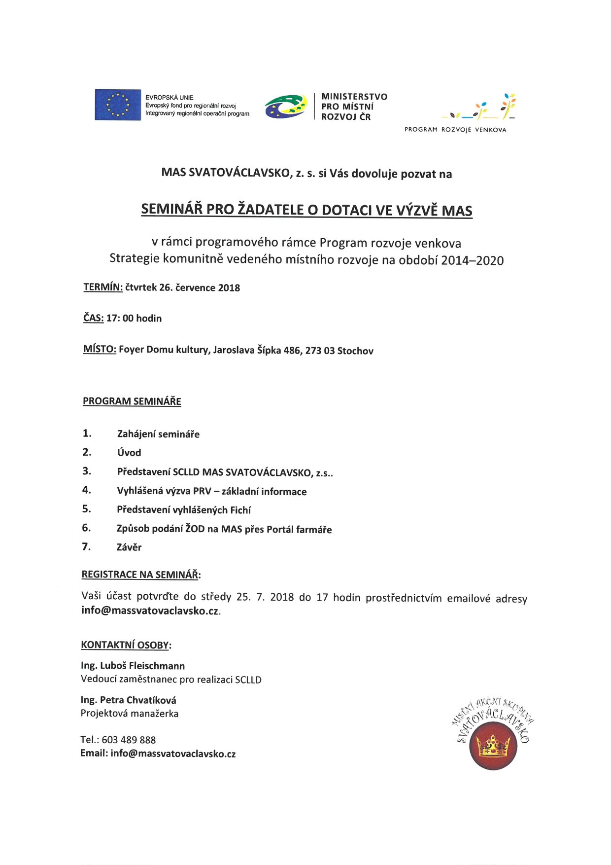 Seminář pro žadatele k výzvě z Programu rozvoje venkova - Investice do zemědělských podniků a Podnikání v nezemědělských činnostech a cestovním ruchu se uskuteční ve čtvrtek 26.7.2018 od 17 hodin ve foyeru Domu kultury ve Stochově, Jaroslava Šípka 486. Více informací o výzvě na webových stránkách MAS v odkazu http://www.svatovaclavsko.cz/cz/program-rozvoje-venkova-prv.